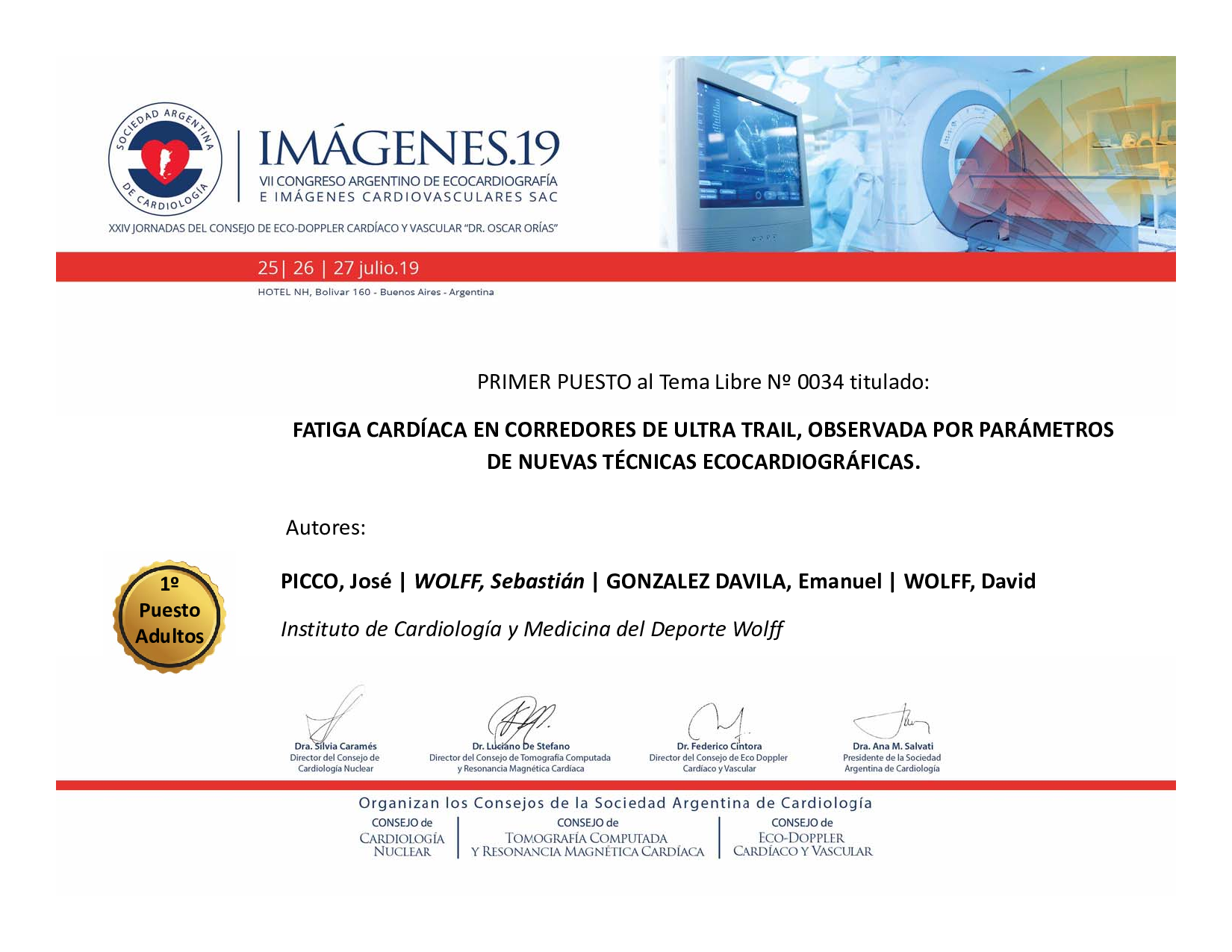 El trabajo de investigación denominado “Fatiga cardíaca en corredores de ultra trail, observada por parámetros de nuevas técnicas ecocardiográficas”, realizado por los doctores José Picco, Sebastián Wolff, Emanuel González Dávila y David Wolff, fue distinguido como mejor trabajo científico y obtuvo el primer puesto de adultos en el Congreso Argentino de Imágenes Cardíacas en la provincia de Buenos Aires.